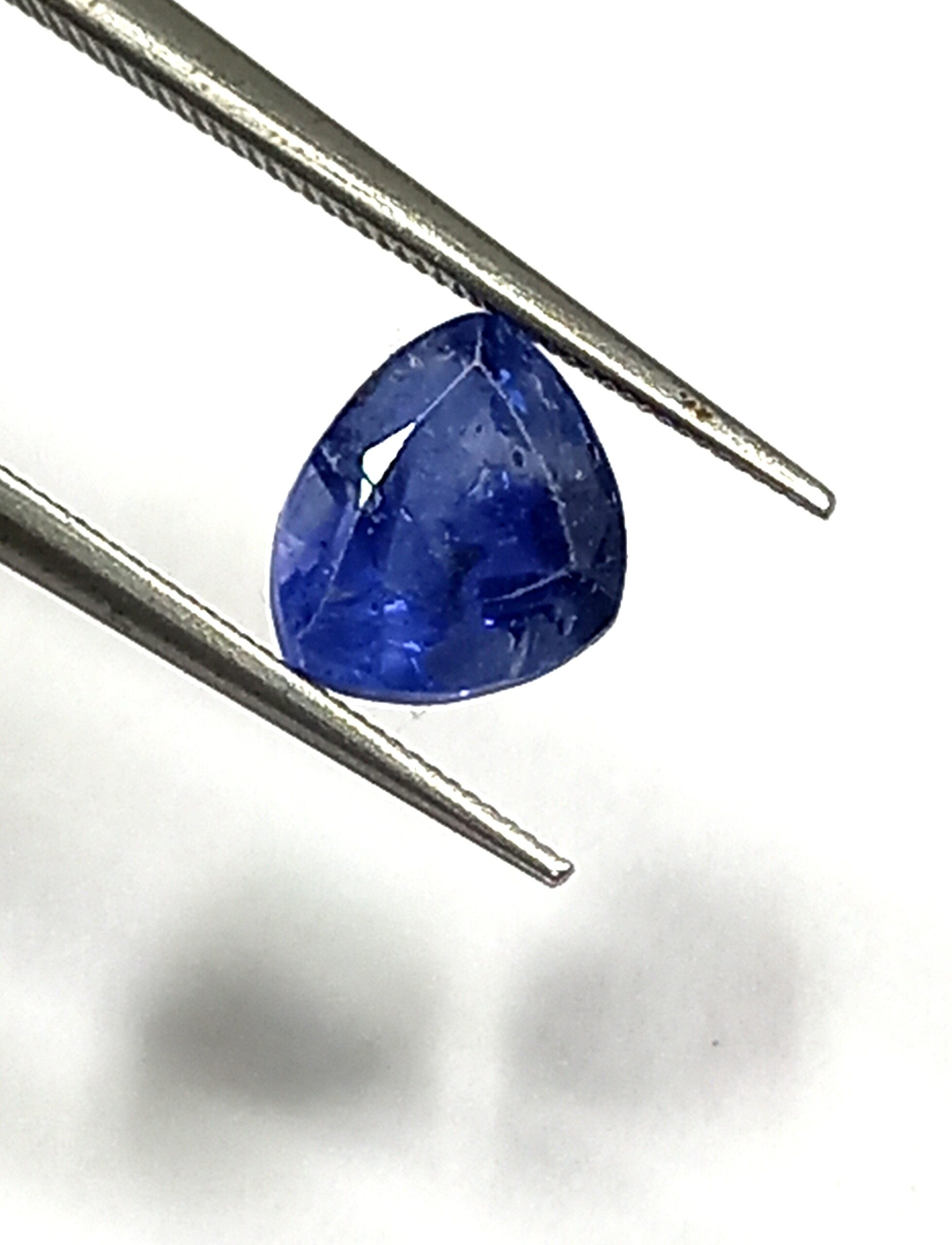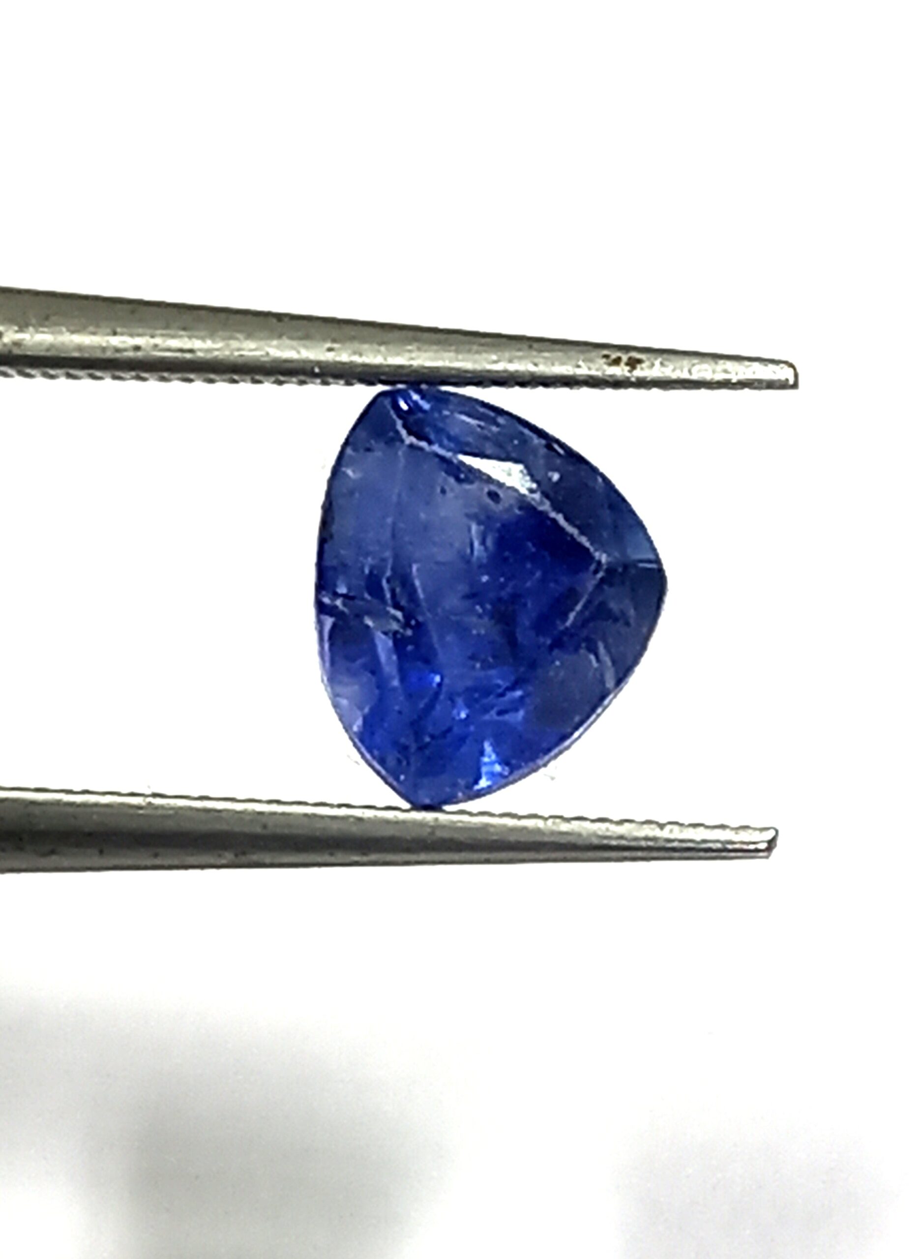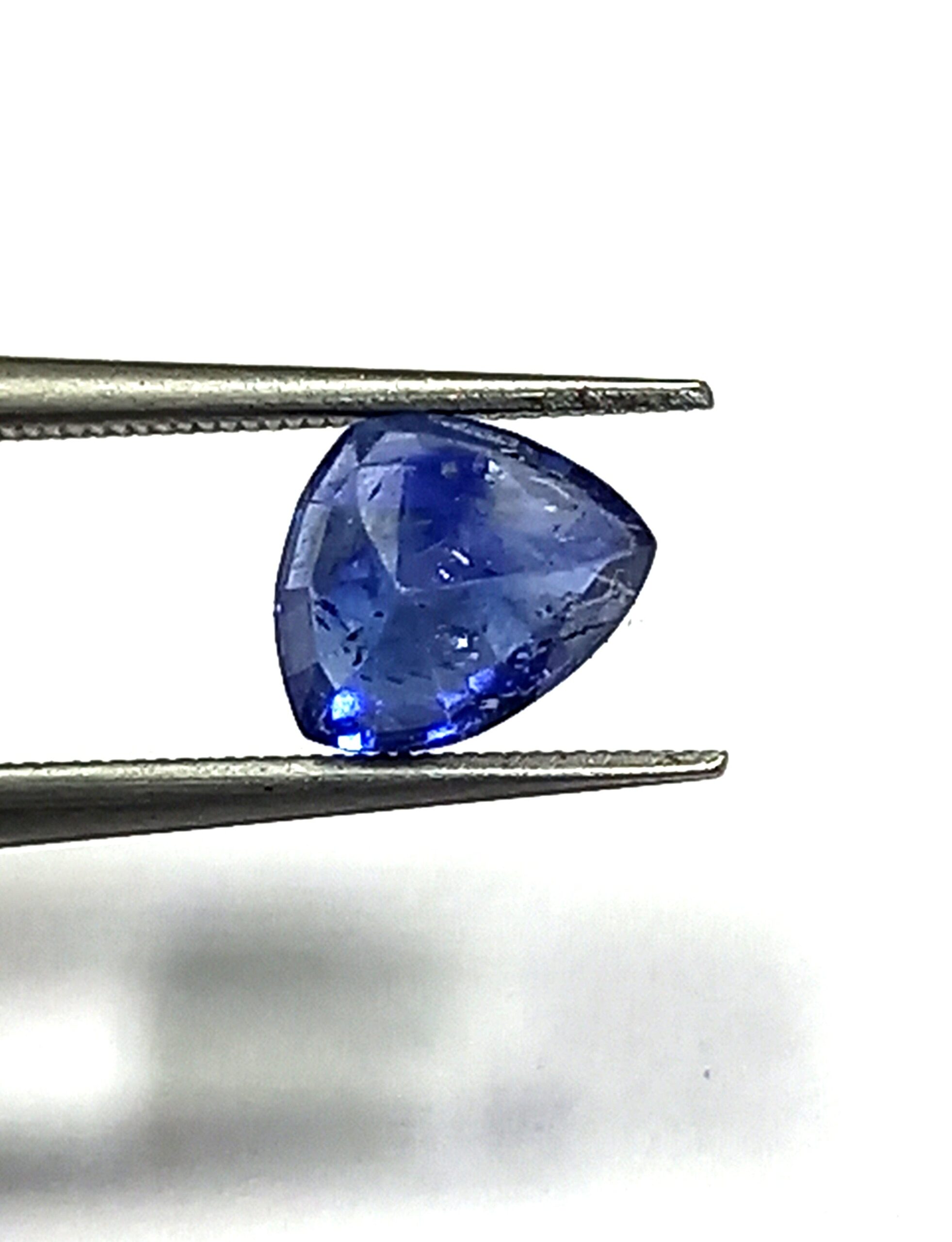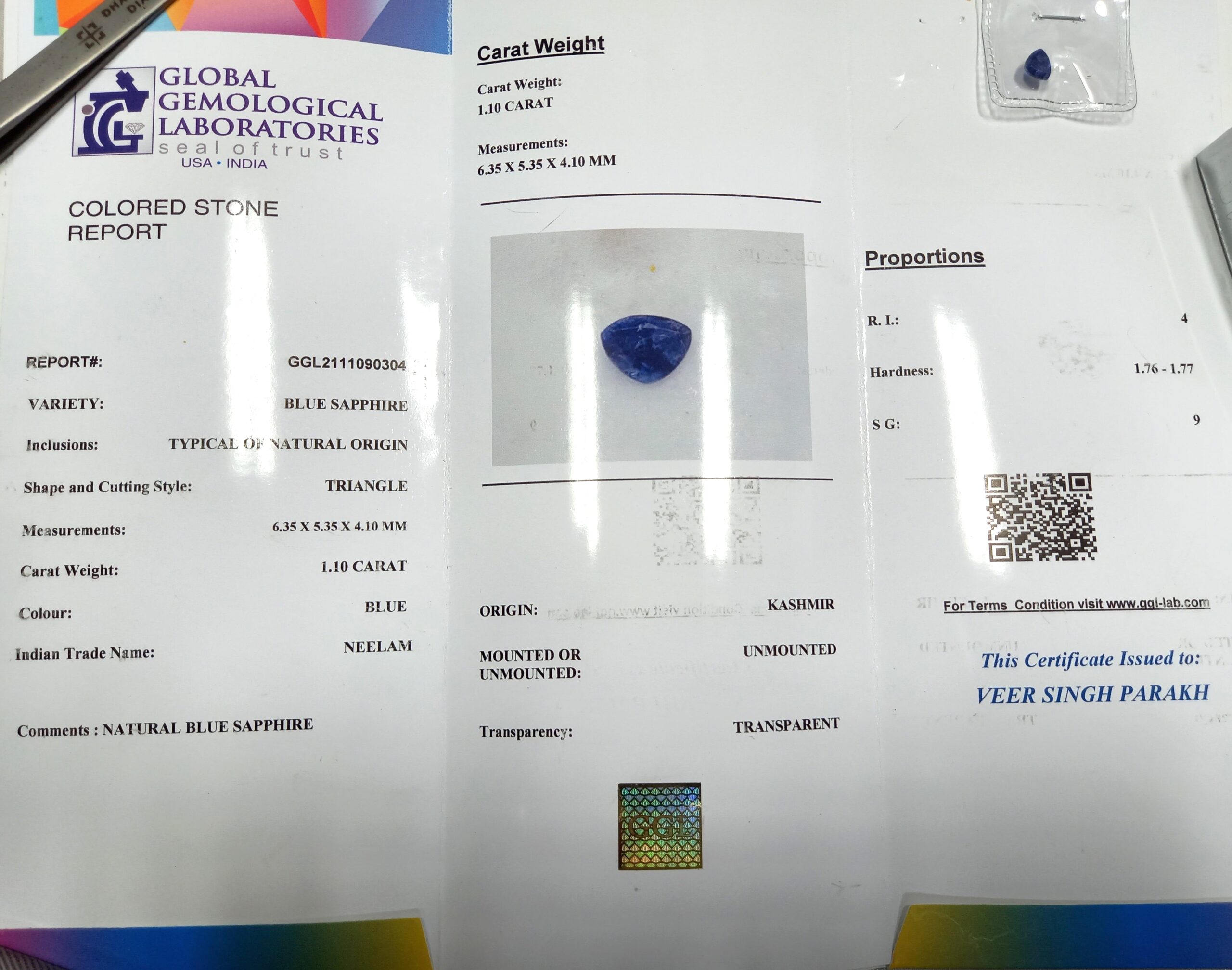 Kashmir Blue Sapphire Oval Cut Certified as natural Kashmir Blue Sapphire, this triangle cut gemstone weighs 1.10 carats and measures 6.35*5.35 mm.