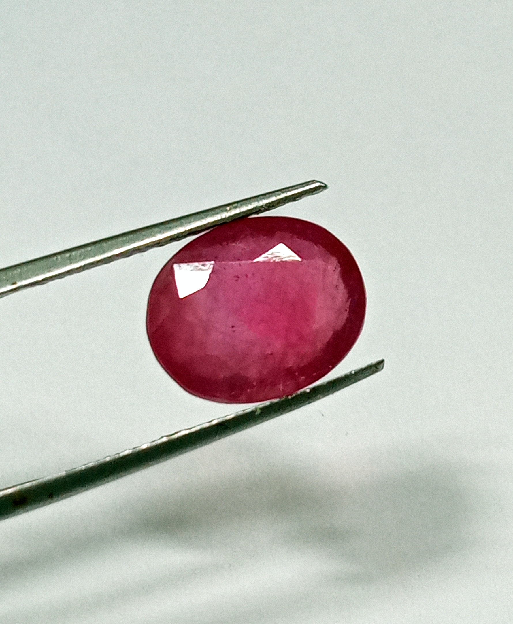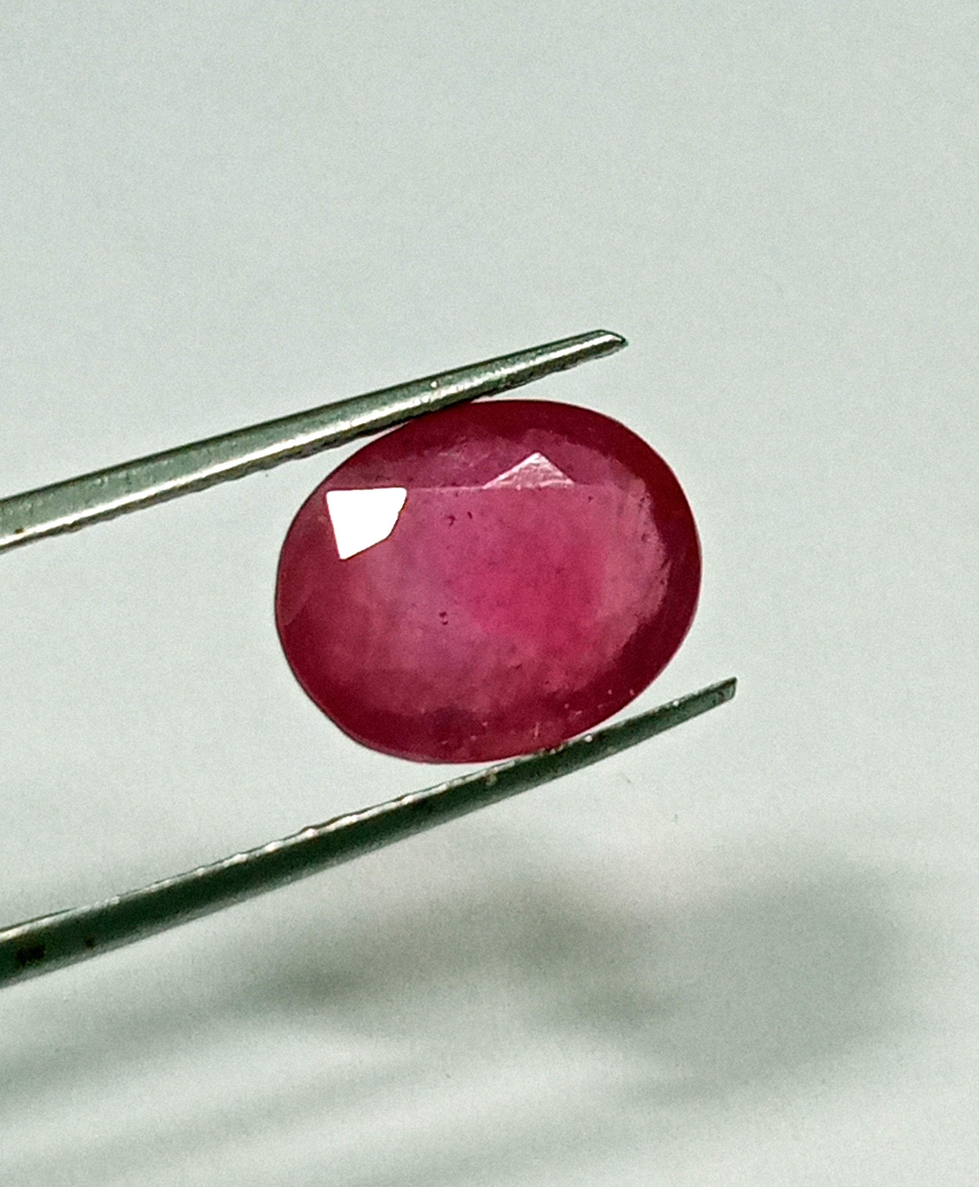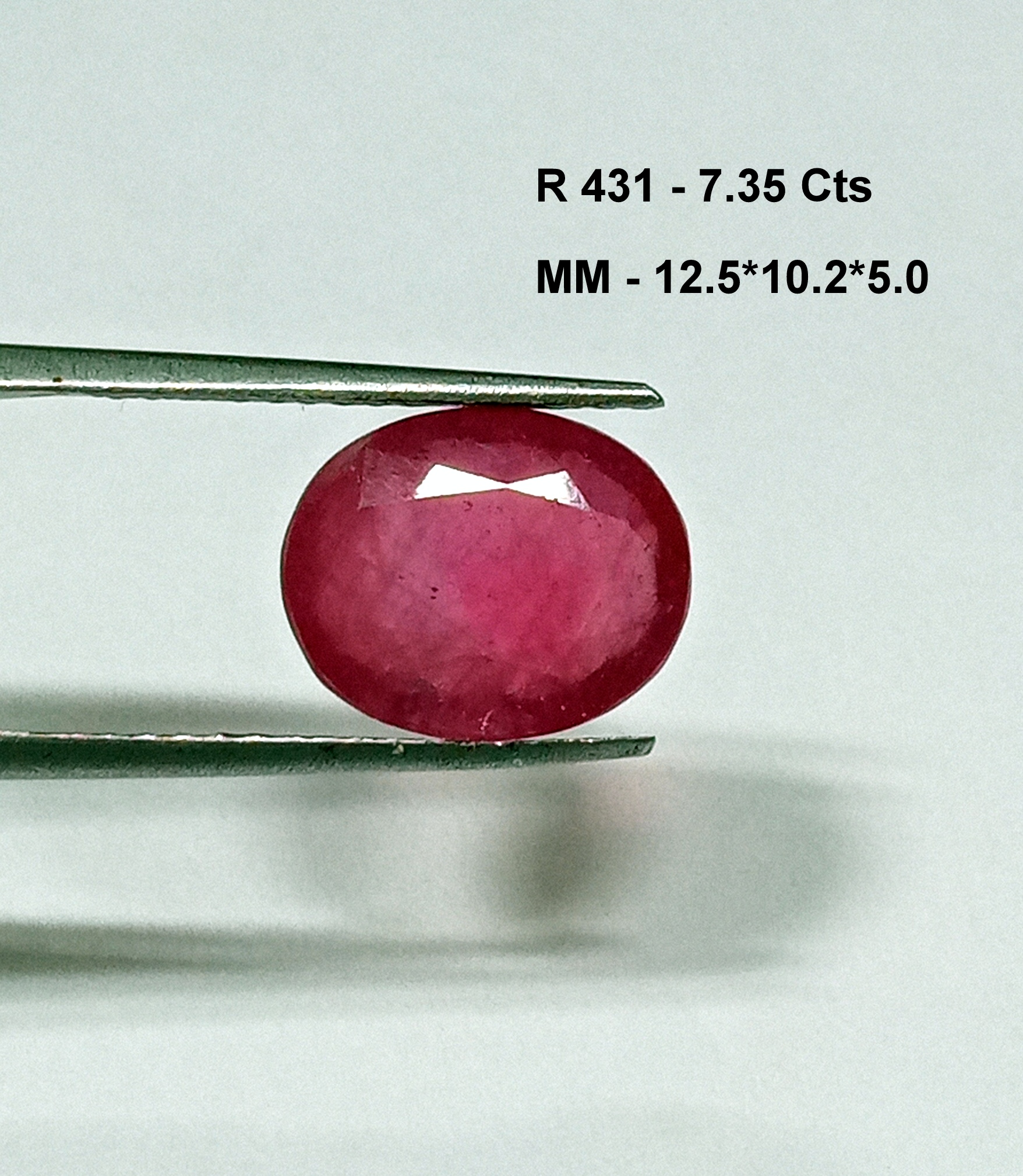 This 7.35-carat natural Burmese red ruby features an elegant oval cut measuring 12.5 by 10.2 mm.