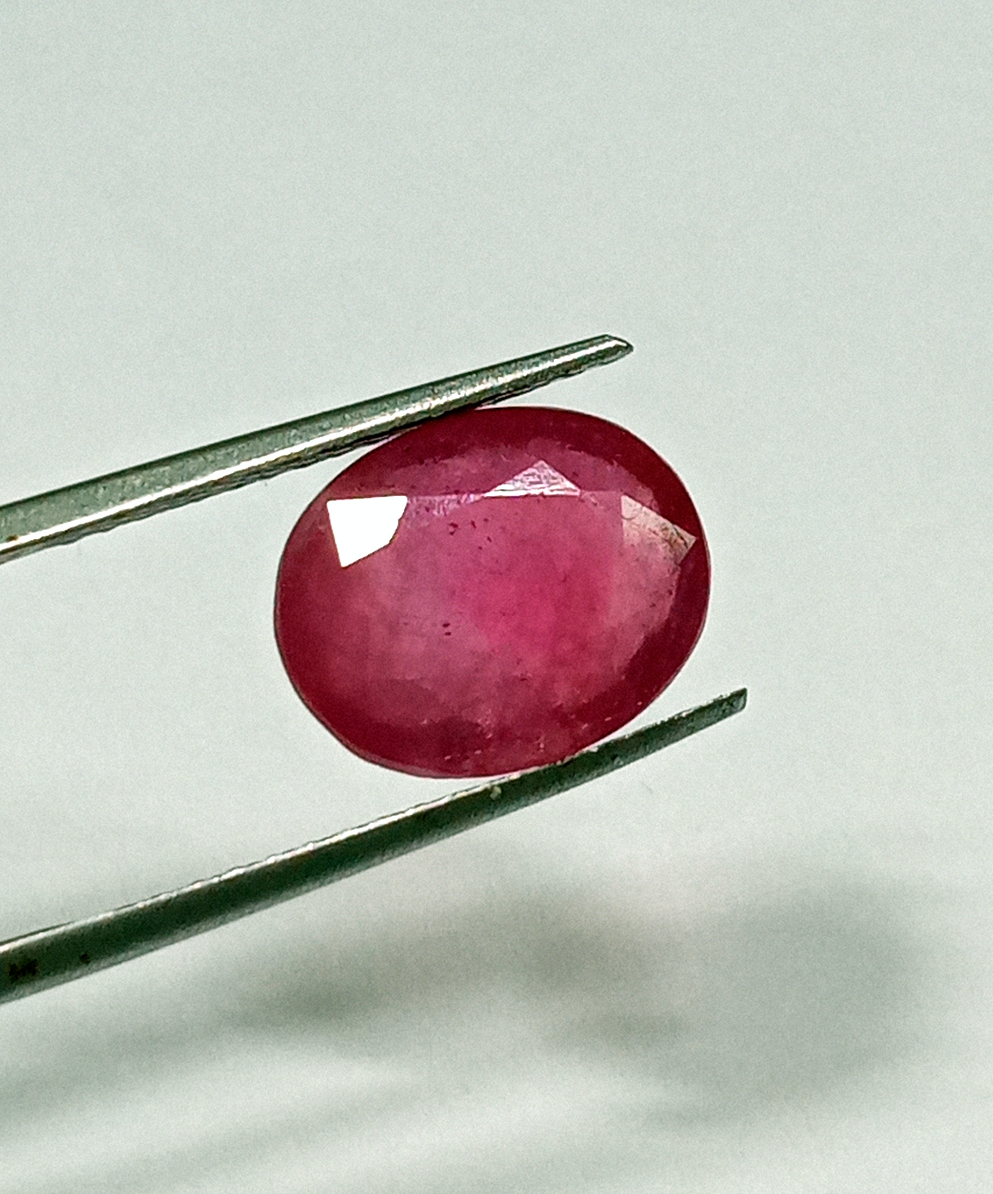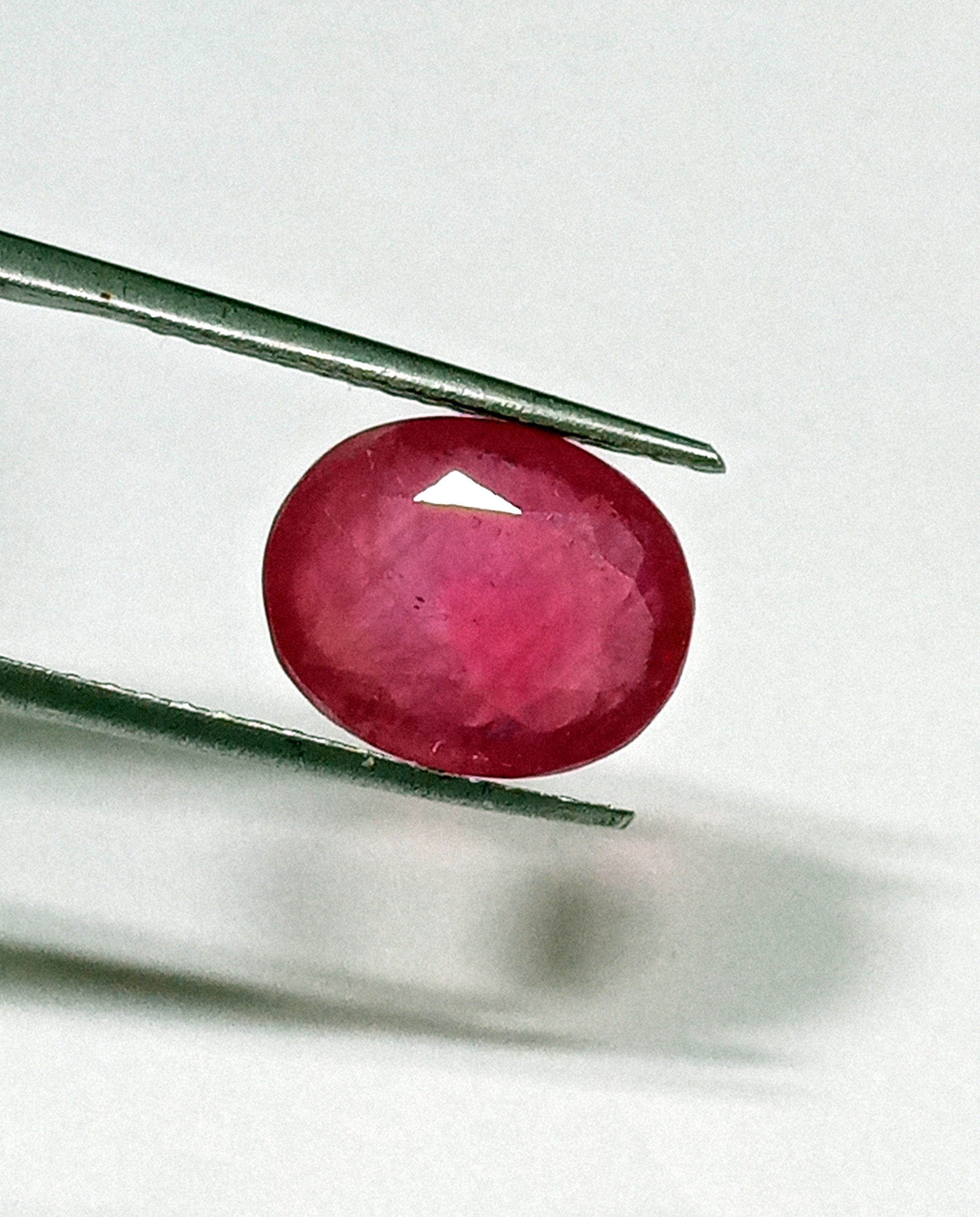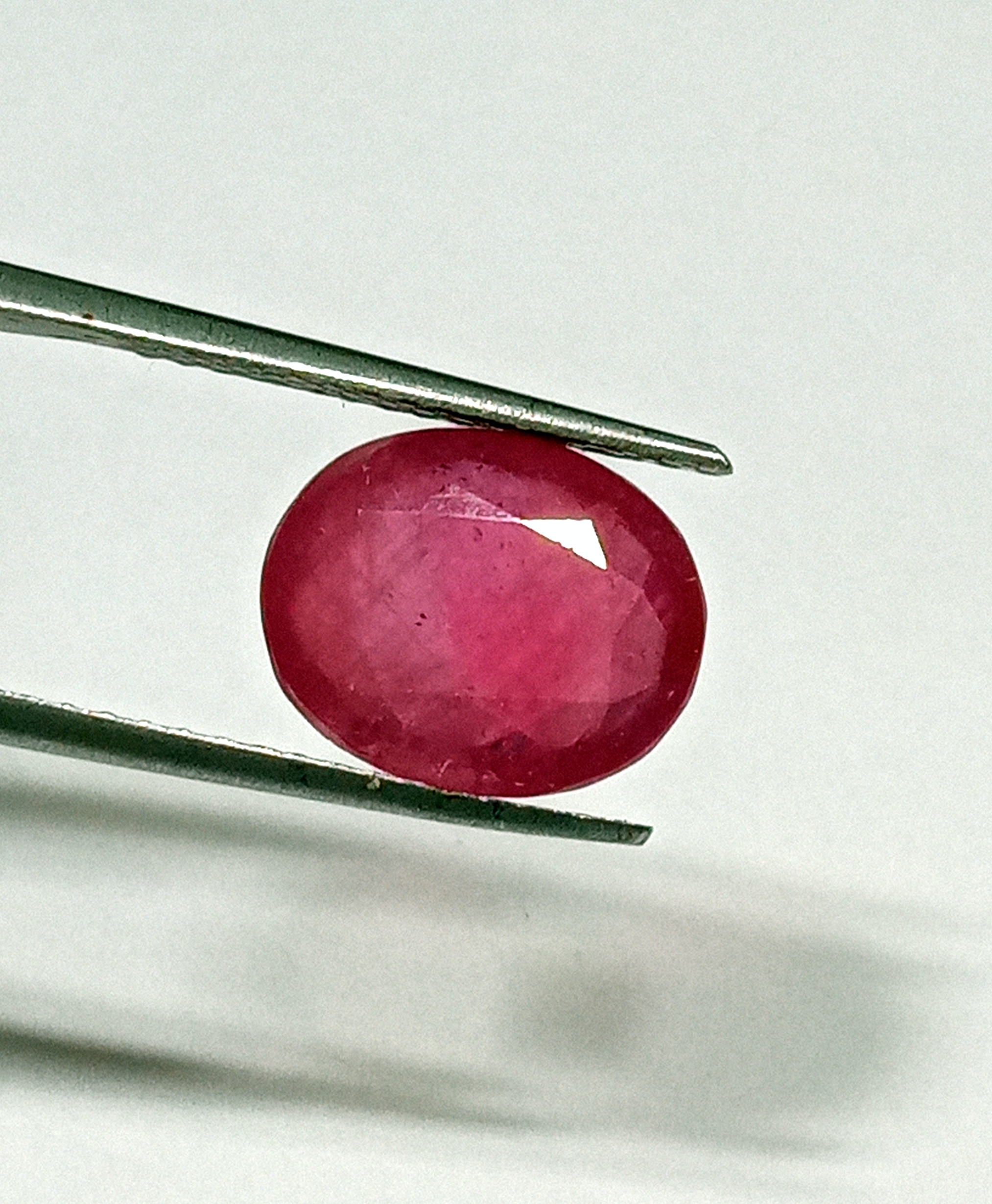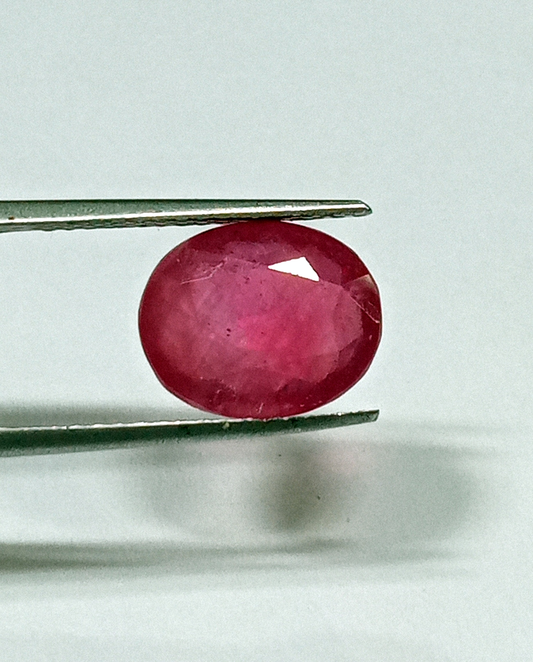 This 7.35-carat natural Burmese red ruby features an elegant oval cut measuring 12.5 by 10.2 mm.