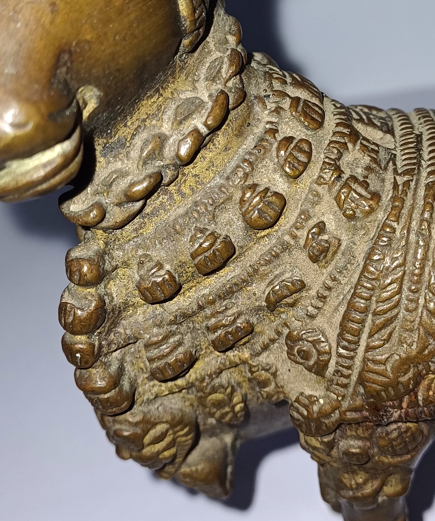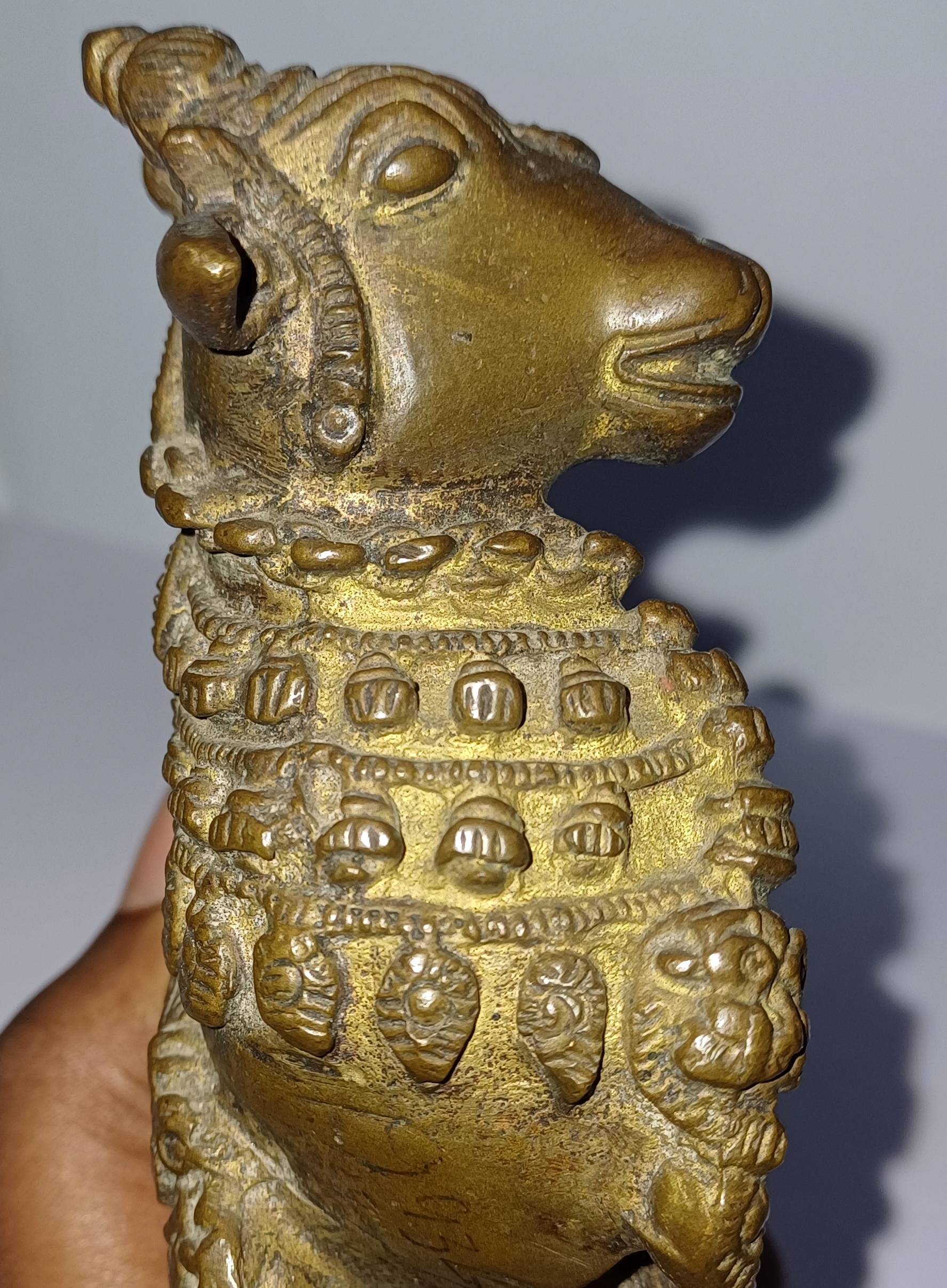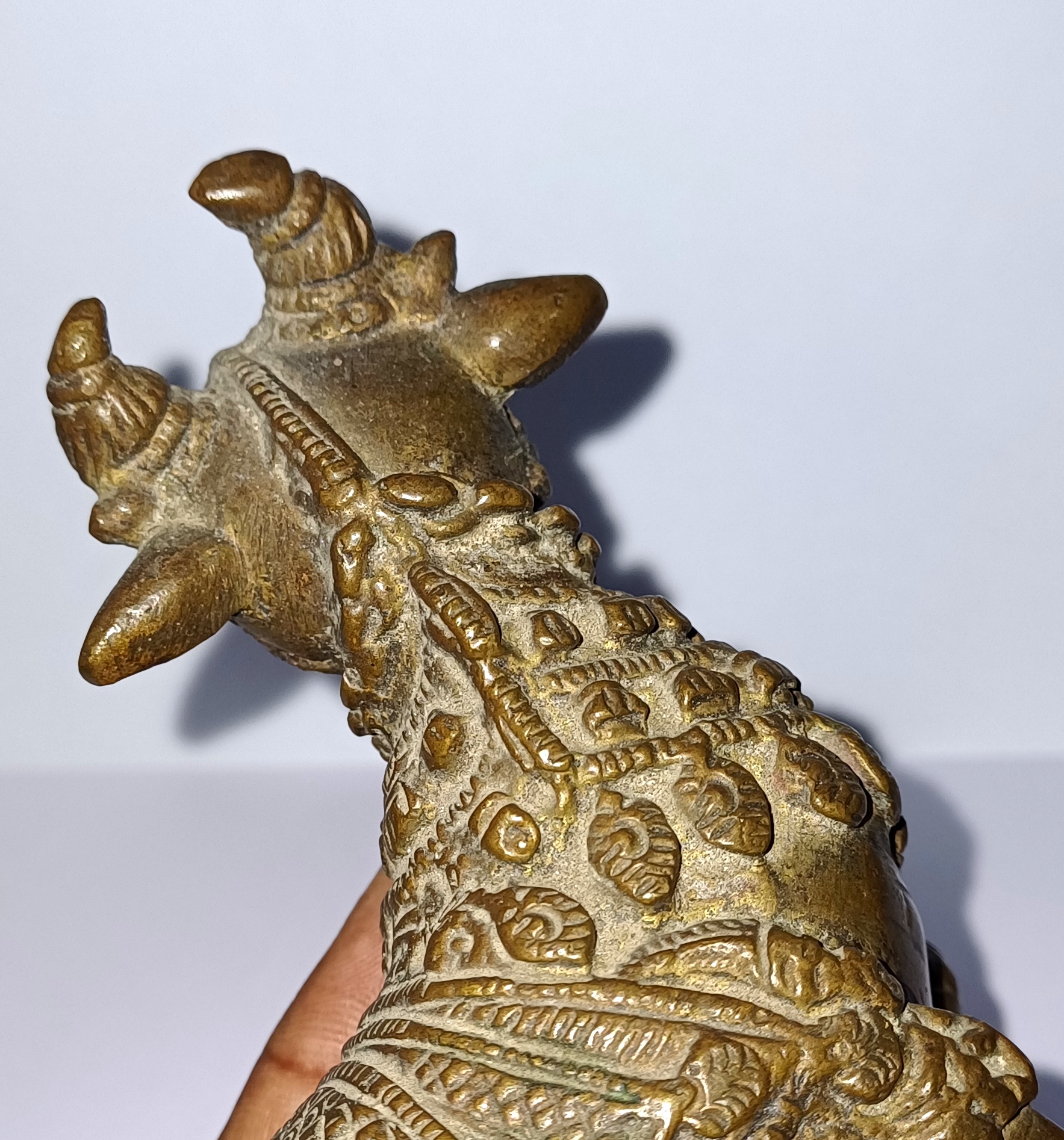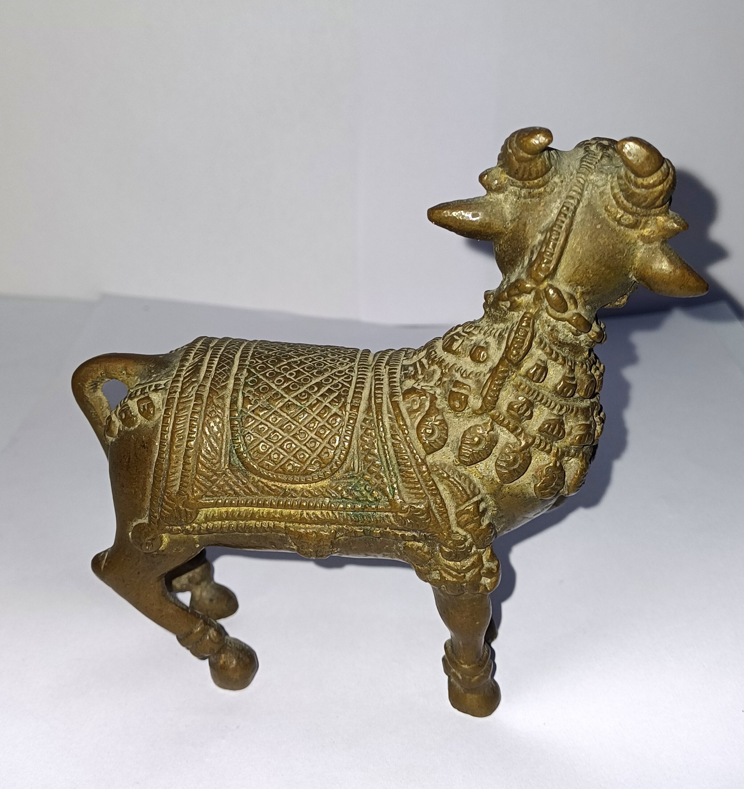 This Antique Kaamdhenu Cow Bronze 19th Century is a rare and sacred find. Measuring 4.5*4.5 inches and weighing 993 grams, it is a beautiful representation of traditional craftsmanship.
